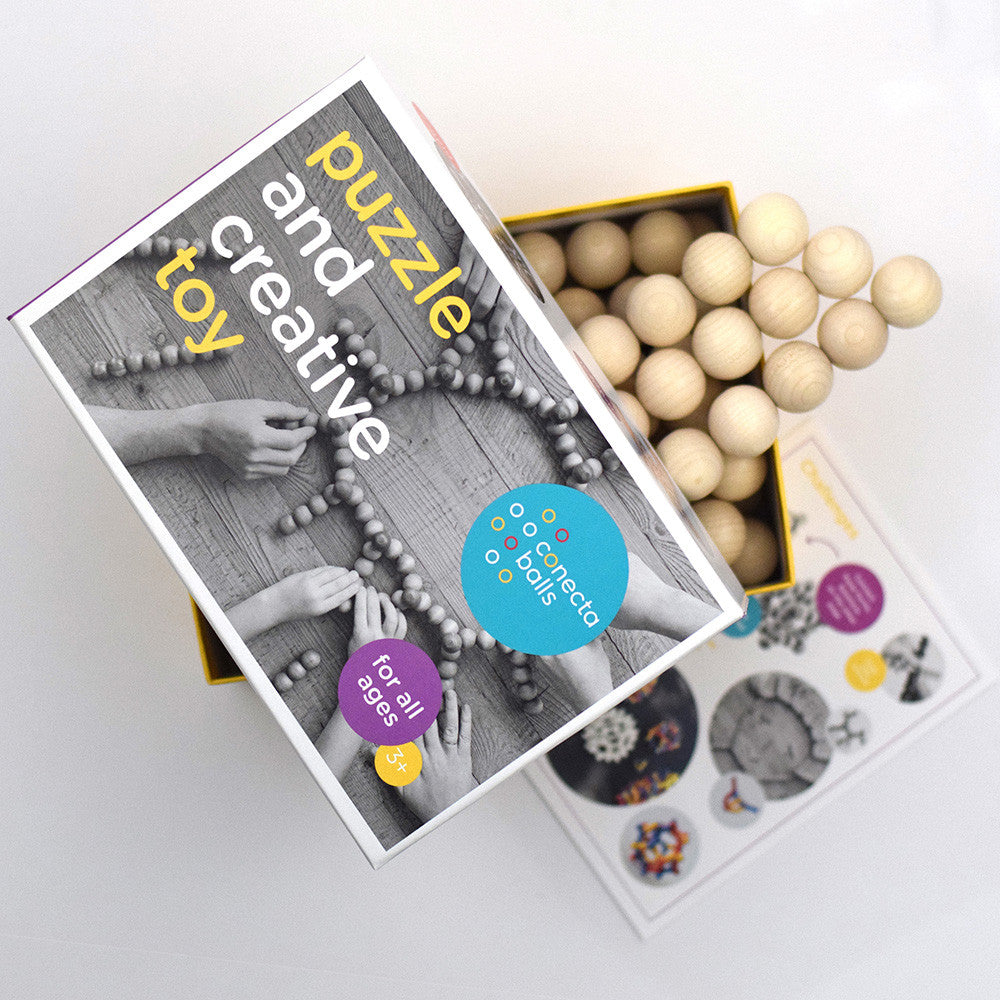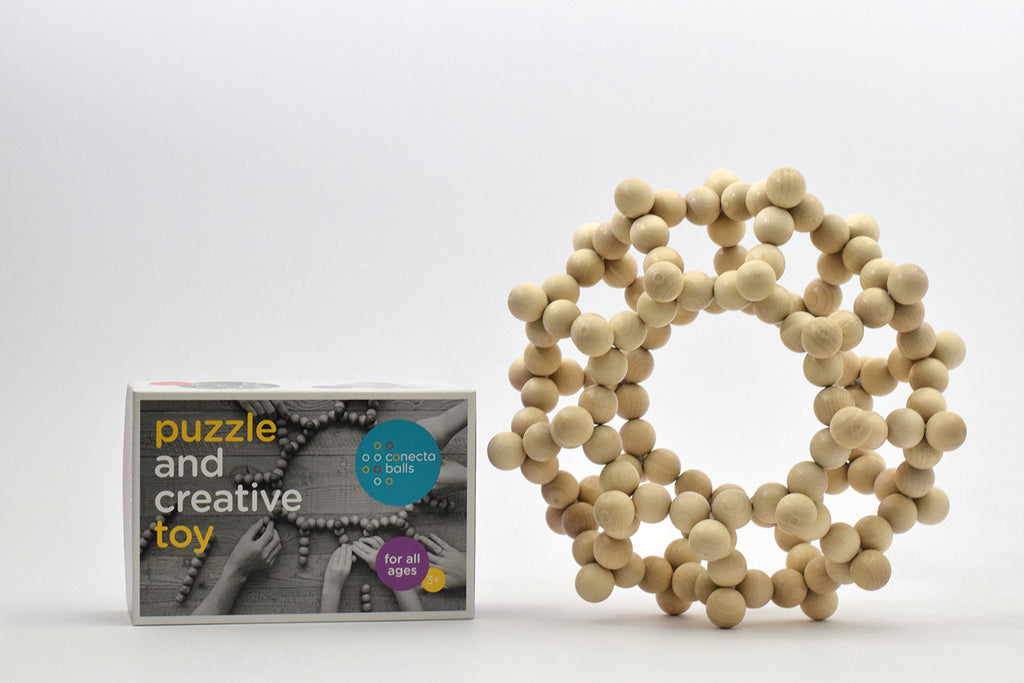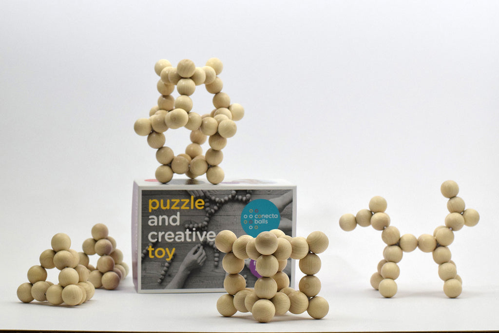 Conectaballs is a 3D puzzle and building toy suitable for all ages. Its beauty is in its simplicity: eight wooden balls joined together on an elastic string. Manipulating Conectaballs strings and connecting them in different ways allows you to create endless geometrical forms. Unlike other 3D puzzles, Conectaballs is not about finding just one correct solution. Our puzzle allows you to construct many spatial forms, and at the same time encourages imagination and creativity by mixing shapes, colors, and patterns.